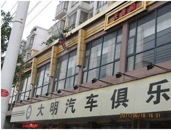 迪邦保潔公司人員正在為“大明汽車(chē)俱樂(lè )部”做外墻玻璃清洗。
