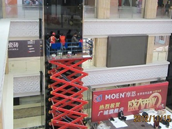 迪邦保潔公司保潔員正在為“廣城家居建材市場(chǎng)”做室內觀(guān)光電梯外墻清洗。